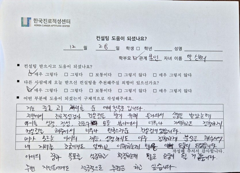 자녀에 대한 깊은 이해 및 성향에 맞는 꿈을 격려하기까지 구체적으로 도움을 드리게 되어 감사한 시간이었습니다.