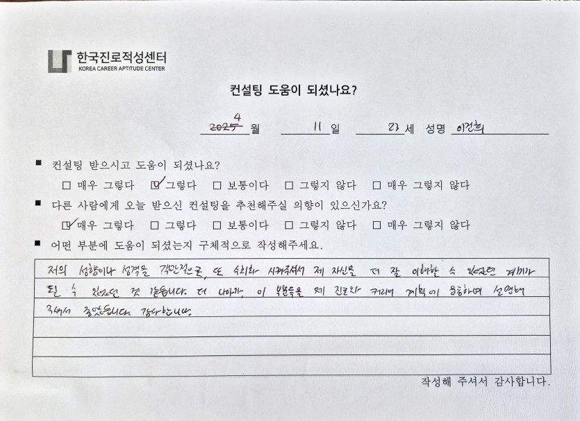 '나'에 대한 깊은 이해와 적합한 진로까지 구체적으로 도움을 드리게 되어 감사한 시간이었습니다.