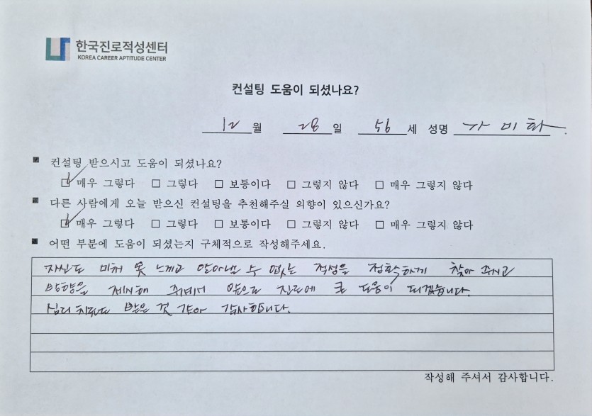 '나'에 대한 깊은 이해와 적합한 진로까지 구체적으로 도움을 드리게 되어 감사한 시간이었습니다.