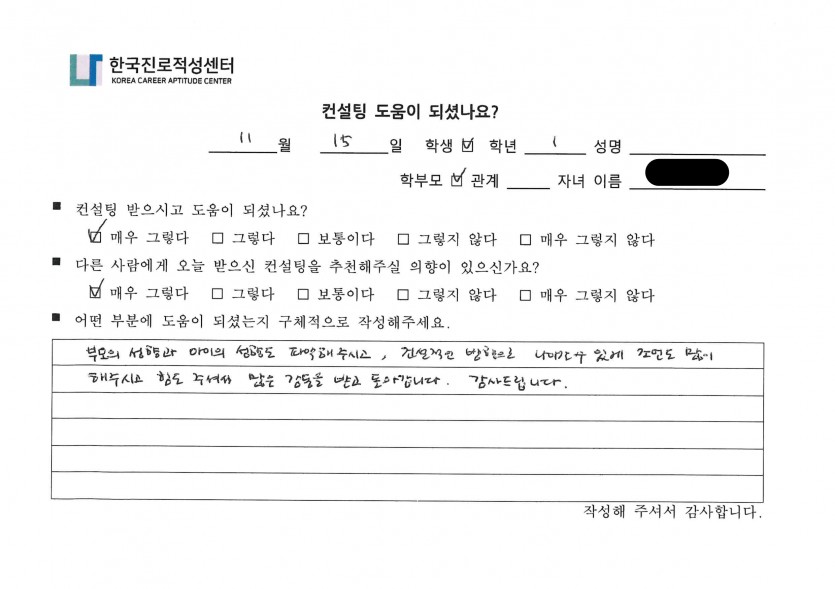 부모의 성향과 아이의 성향도 파악해주시고 건설적인 방향으로 나아갈 수 있게 조언도 많이 해주시고 힘도 주셔서 많은 감동을 받고 돌아갑니다. 감사드립니다.