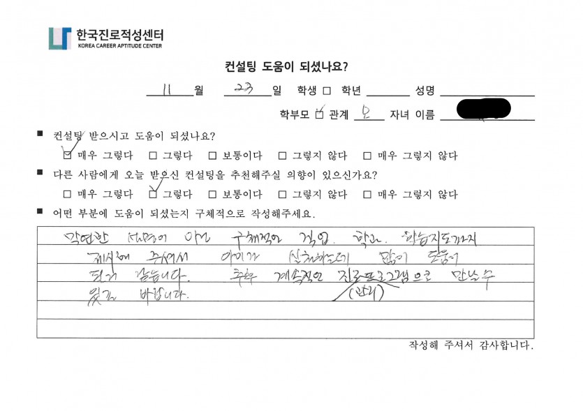 자녀에 대한 깊은 이해 및 적합한 학습법 제시로 구체적으로 도움을 드리게 되어 감사한 시간이었습니다.