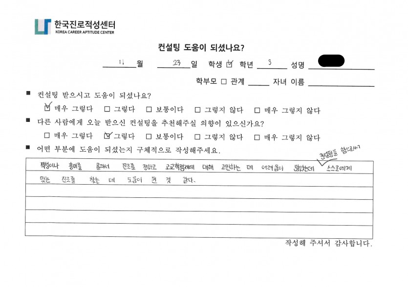컨설팅을 함으로써 스스로에게 맞는 진로를 찾는 데 도움이 된 것 같다.