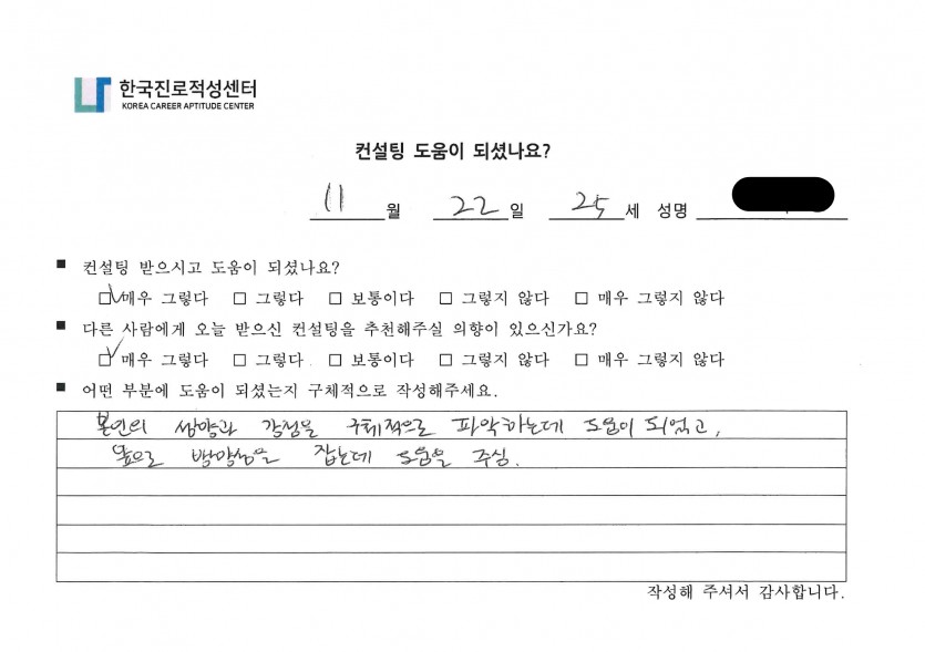 '나'에 대한 깊은 이해와 적합한 진로까지 구체적으로 도움을 드리게 되어 감사한 시간이었습니다.