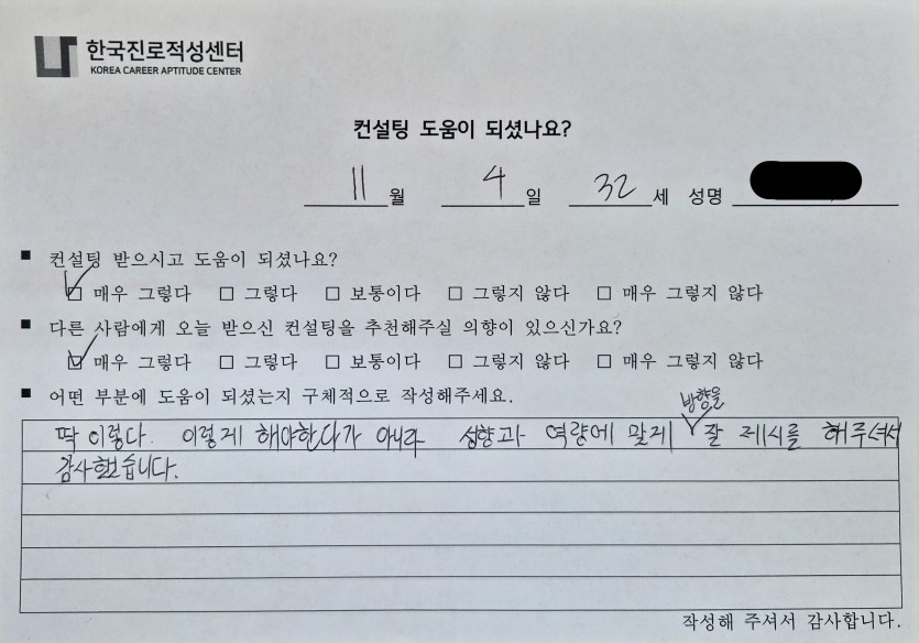 '나'에 대한 깊은 이해와 적합한 진로까지 구체적으로 도움을 드리게 되어 감사한 시간이었습니다.