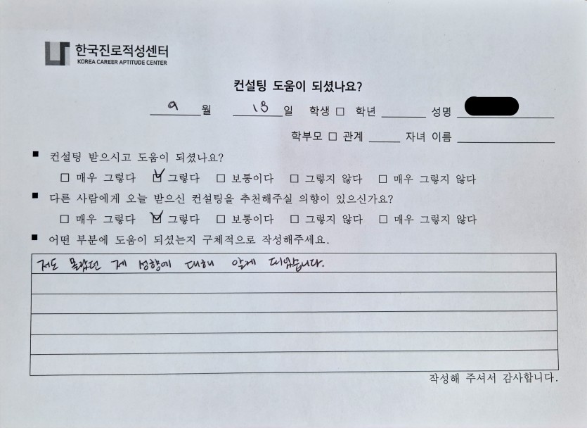 '나'에 대한 깊은 이해와 적합한 진로까지 구체적으로 도움을 드리게 되어 감사한 시간이었습니다.