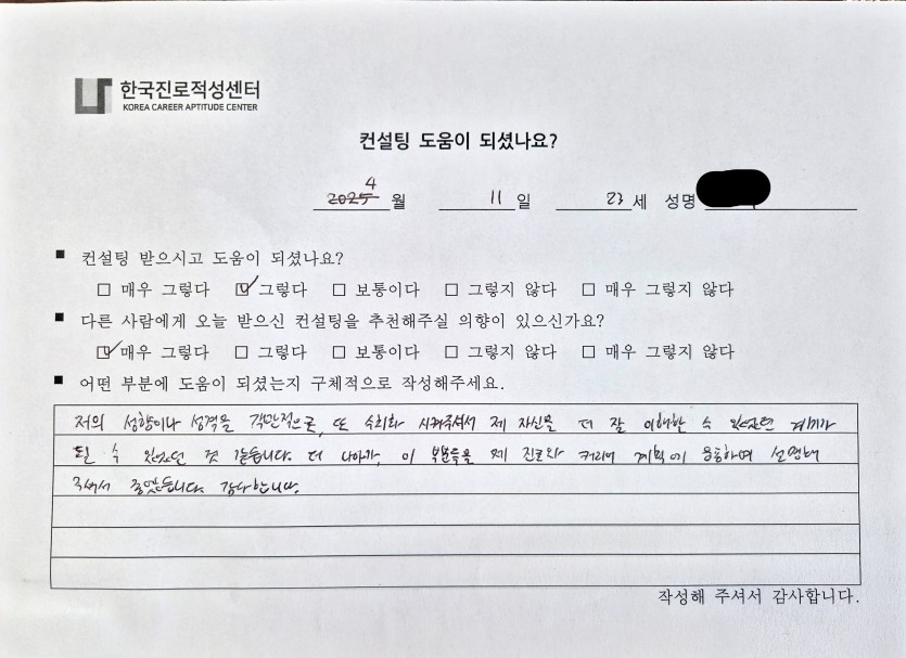 '나'에 대한 깊은 이해와 적합한 진로까지 구체적으로 도움을 드리게 되어 감사한 시간이었습니다.