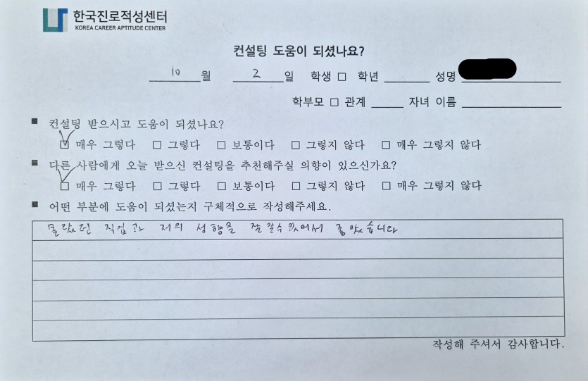 '나'에 대한 깊은 이해와 적합한 진로까지 구체적으로 도움을 드리게 되어 감사한 시간이었습니다.