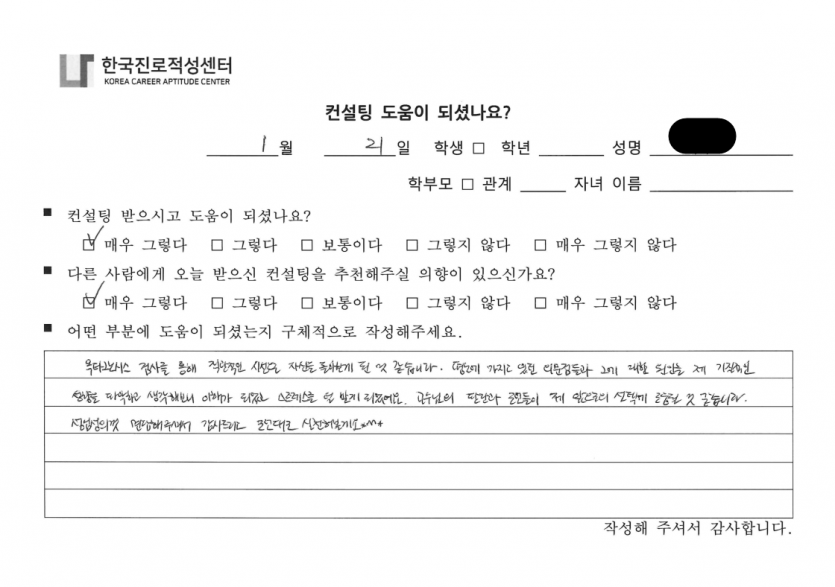 '나'에 대한 깊은 이해와 적합한 진로까지 구체적으로 도움을 드리게 되어 감사한 시간이었습니다.