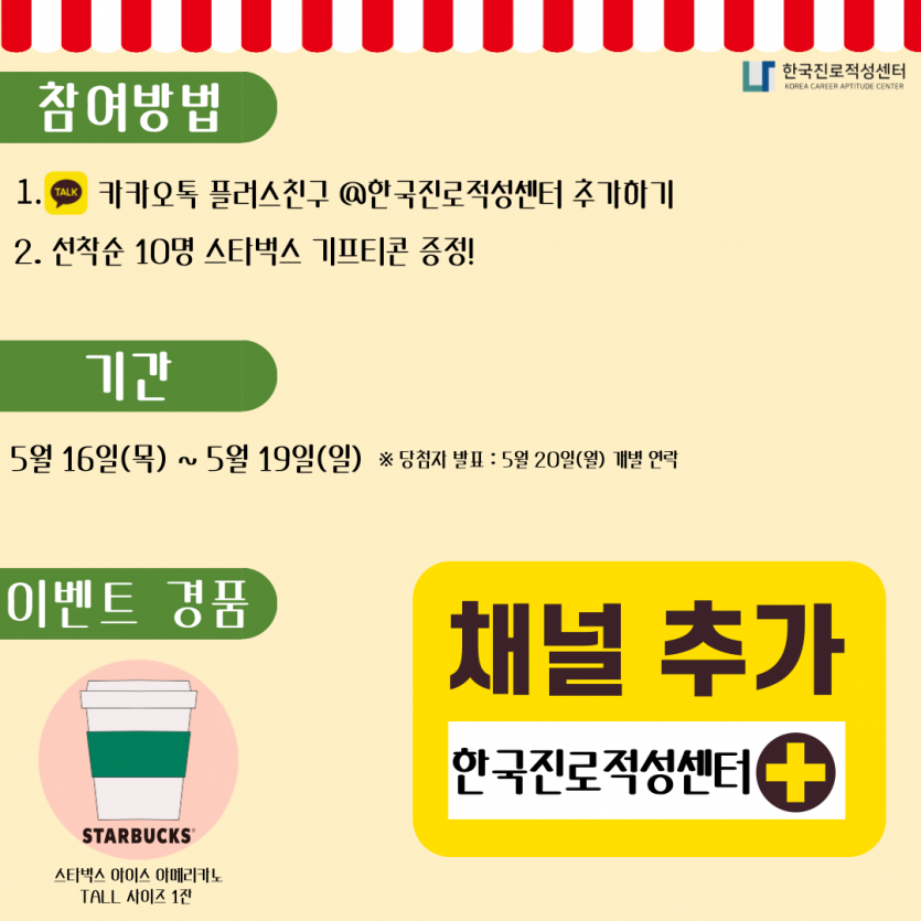 한국진로적성센터 카카오톡 플러스친구 추가하고 경품받자! 페이지 정보 작성자 한국진로적성센터 댓글 0건 조회 2,049회 작성일 24-05-13 14:58 본문 한국진로적성센터가 카카오톡 채널을 개설했습니다!한.진.센 카카오톡 채널 추가하고 경품 받아가세요~!!그럼, 참여 방법을 알아볼까요? 카카오톡 플러스친구 @한국진로적성센터 추가하기만 하면 끝!선착순으로 스타벅스 아메리카노 기프티콘을 드려요 >.<이제는 한.진.센의 새롭고 다양한 소식을 카카오톡 채널에서도 만나요~!! 목록 이전글한국진로적성센터 5/23(목) 라이브방송 대비 초성퀴즈 이벤트 24.05.20 다음글한국진로적성센터 박에스더 대표 유튜브 라이브 방송! 가정의 달 할인 이벤트! 24.05.03 댓글목록 댓글목록 등록된 댓글이 없습니다.