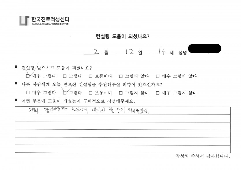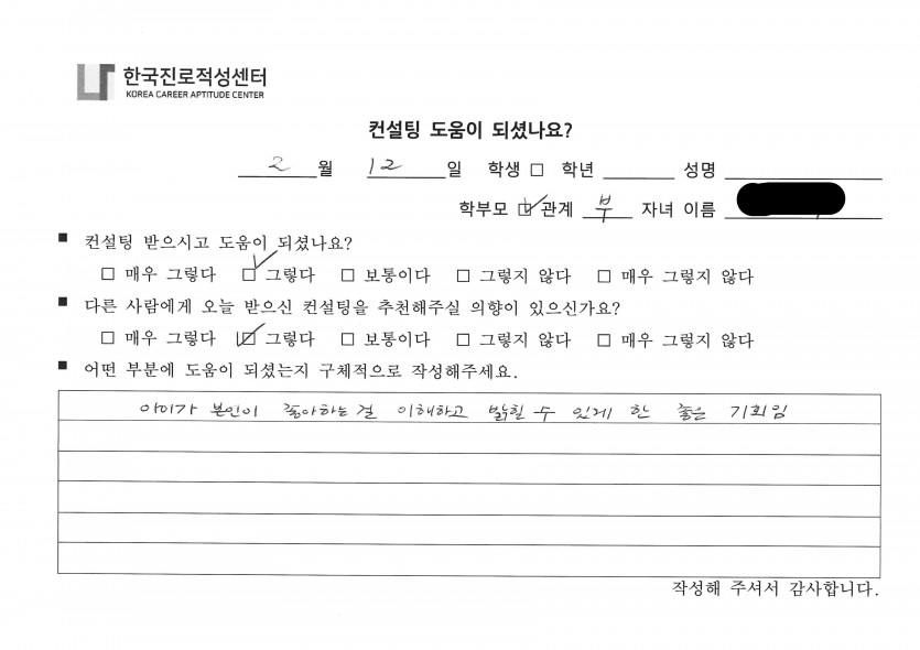 '나'에 대한 깊은 이해와 적합한 진로까지 구체적으로 도움을 드리게 되어 감사한 시간이었습니다.