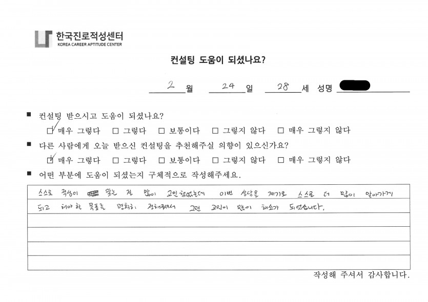 '나'에 대한 깊은 이해와 적합한 진로까지 구체적으로 도움을 드리게 되어 감사한 시간이었습니다.