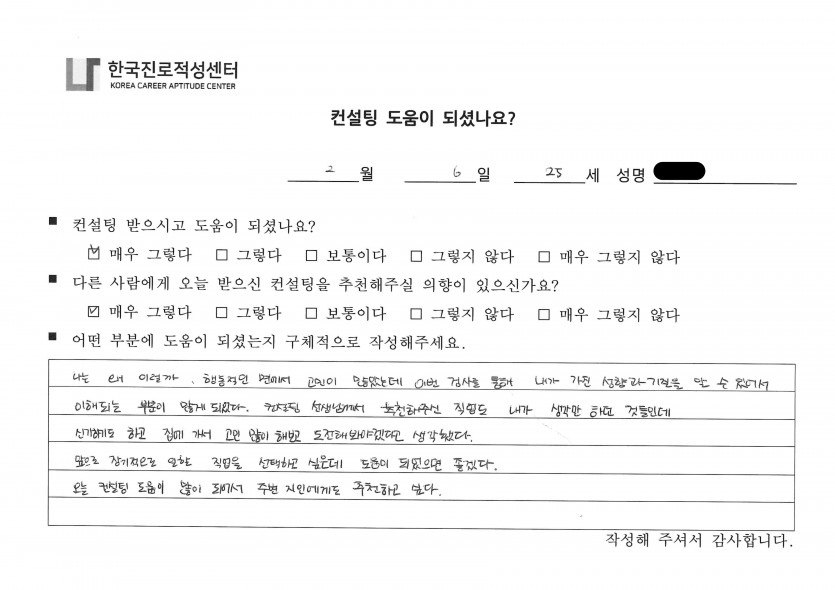 '나'에 대한 깊은 이해와 적합한 진로까지 구체적으로 도움을 드리게 되어 감사한 시간이었습니다.