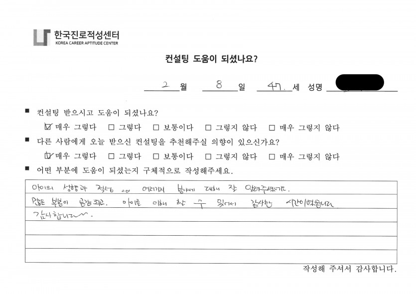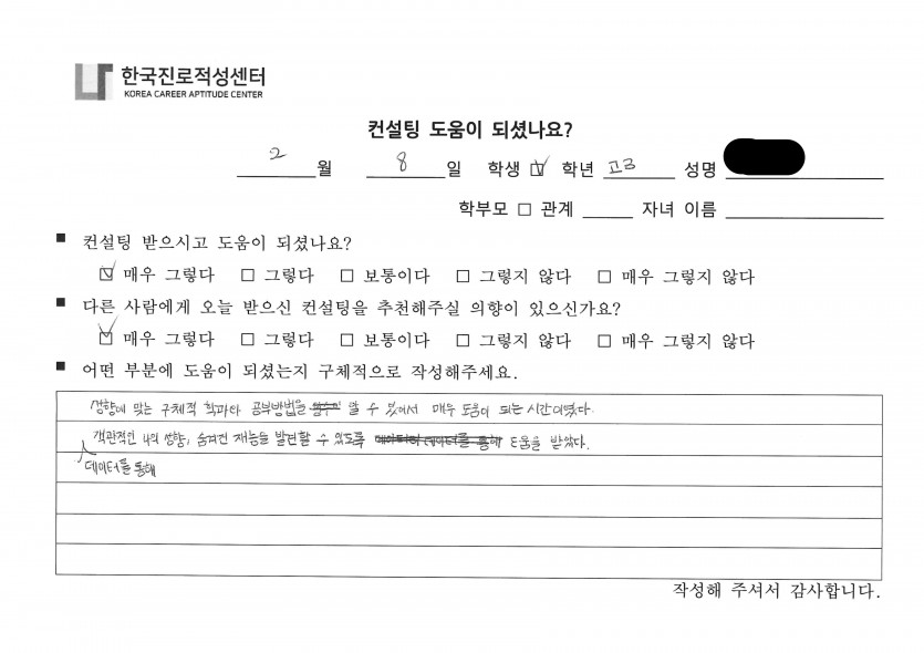 '나'에 대한 깊은 이해와 적합한 진로까지 구체적으로 도움을 드리게 되어 감사한 시간이었습니다.