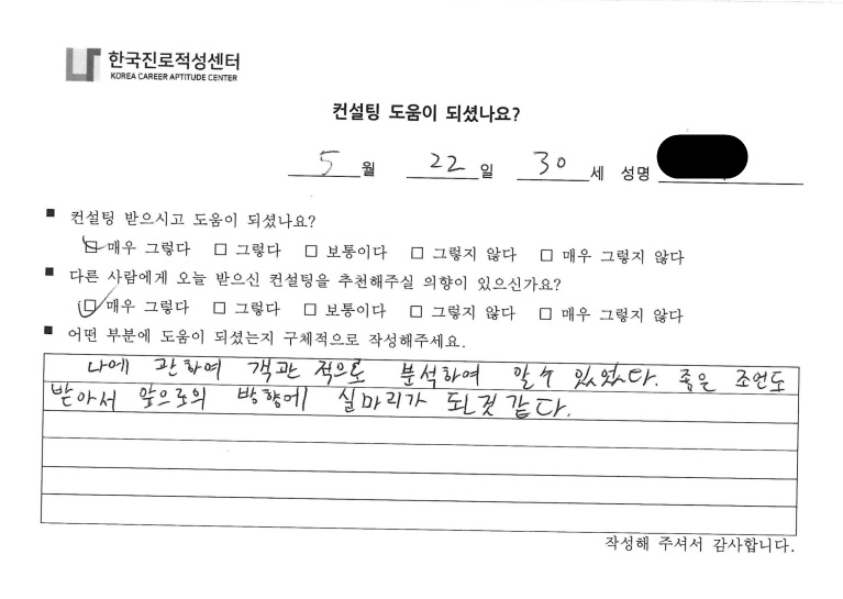 '나'에 대한 깊은 이해와 적합한 진로까지 구체적으로 도움을 드리게 되어 감사한 시간이었습니다.