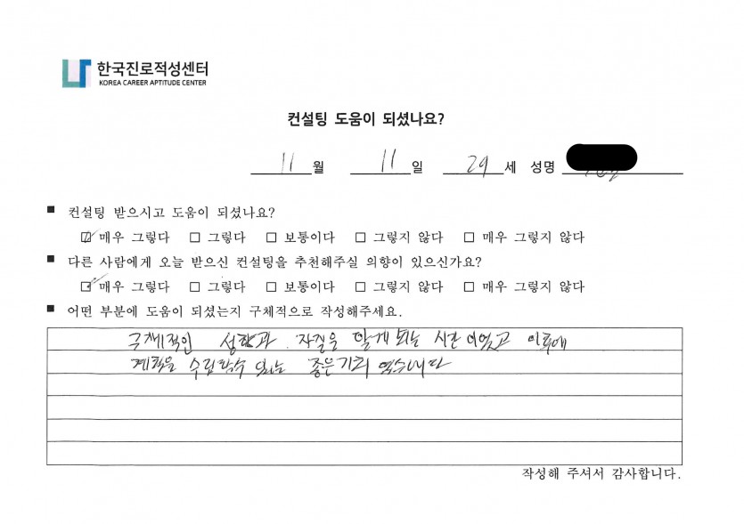 '나'에 대한 깊은 이해와 적합한 진로까지 구체적으로 도움을 드리게 되어 감사한 시간이었습니다.