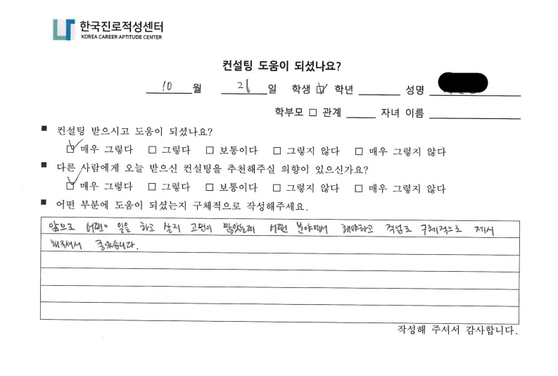 '나'에 대한 깊은 이해와 적합한 진로까지 구체적으로 도움을 드리게 되어 감사한 시간이었습니다.