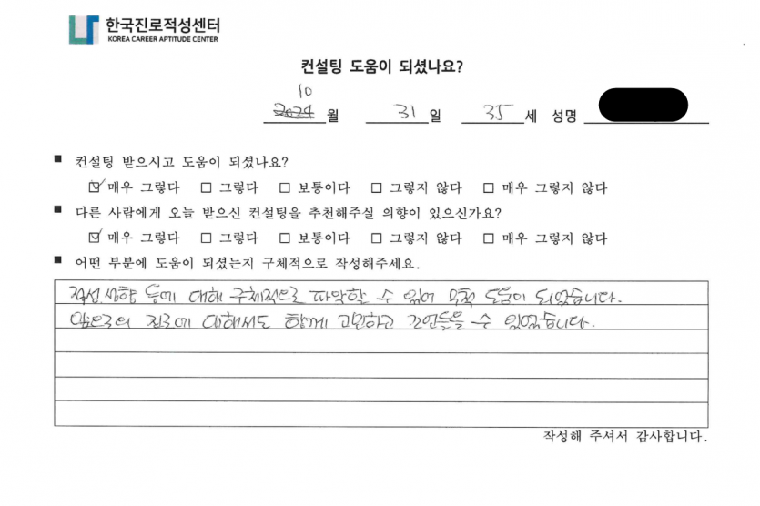 '나'에 대한 깊은 이해와 적합한 진로까지 구체적으로 도움을 드리게 되어 감사한 시간이었습니다.