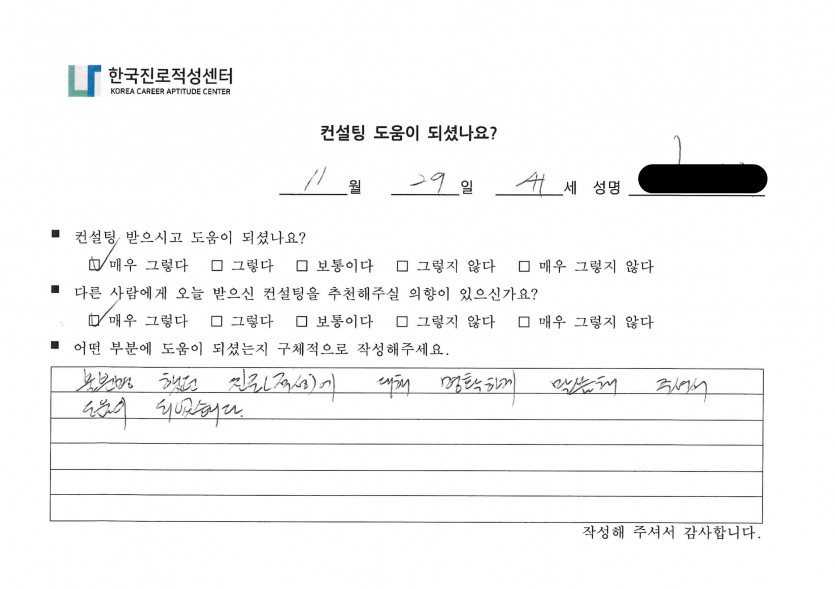 '나'에 대한 깊은 이해와 적합한 진로까지 구체적으로 도움을 드리게 되어 감사한 시간이었습니다.