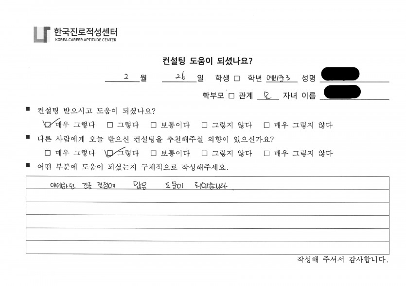 '나'에 대한 깊은 이해와 적합한 진로까지 구체적으로 도움을 드리게 되어 감사한 시간이었습니다.