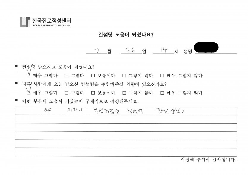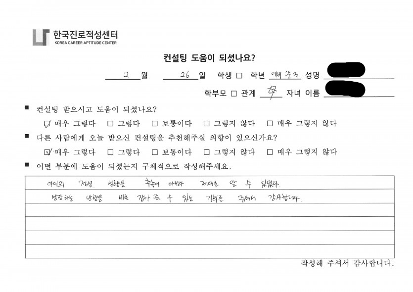 '나'에 대한 깊은 이해와 적합한 진로까지 구체적으로 도움을 드리게 되어 감사한 시간이었습니다.