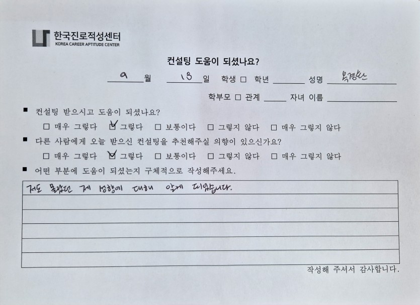 '나'에 대한 깊은 이해와 적합한 진로까지 구체적으로 도움을 드리게 되어 감사한 시간이었습니다.