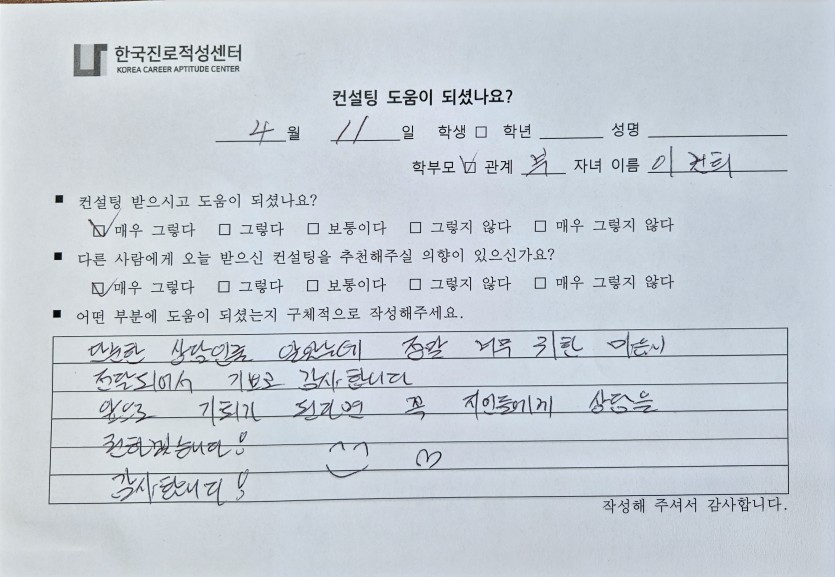 '나'에 대한 깊은 이해와 적합한 진로까지 구체적으로 도움을 드리게 되어 감사한 시간이었습니다.