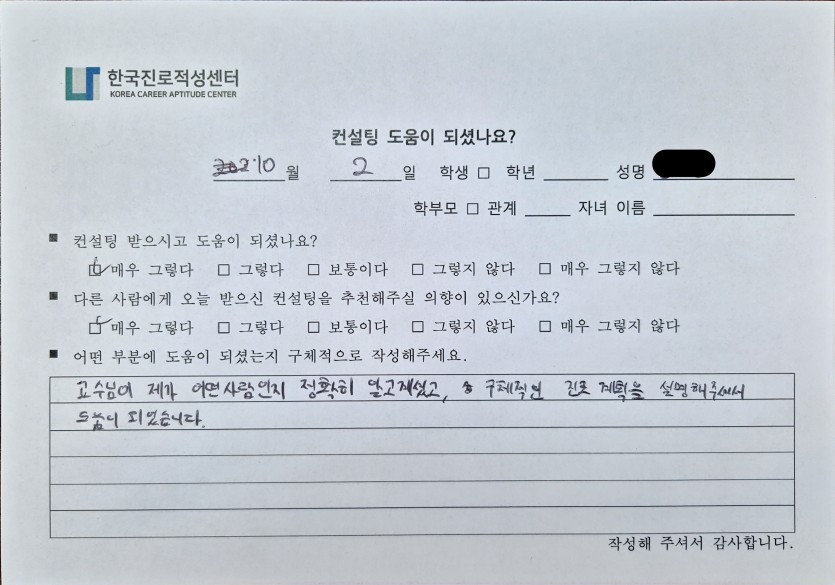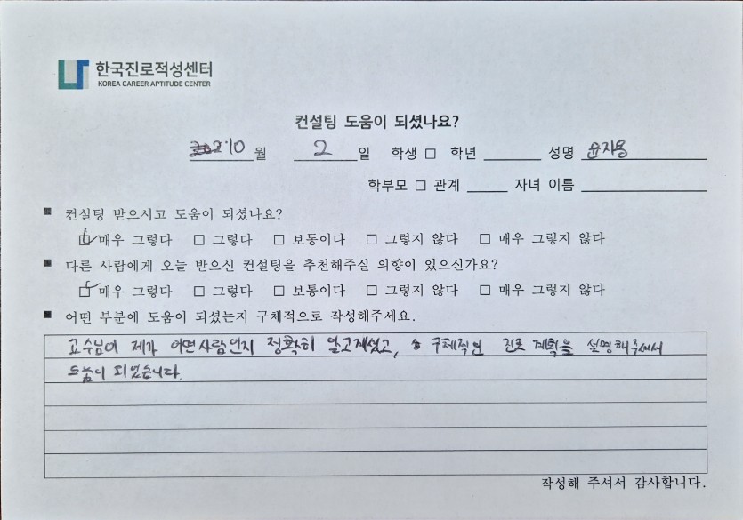 '나'에 대한 깊은 이해와 적합한 진로까지 구체적으로 도움을 드리게 되어 감사한 시간이었습니다.
