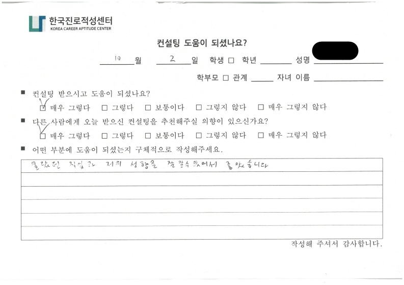 '나'에 대한 깊은 이해와 적합한 진로까지 구체적으로 도움을 드리게 되어 감사한 시간이었습니다.